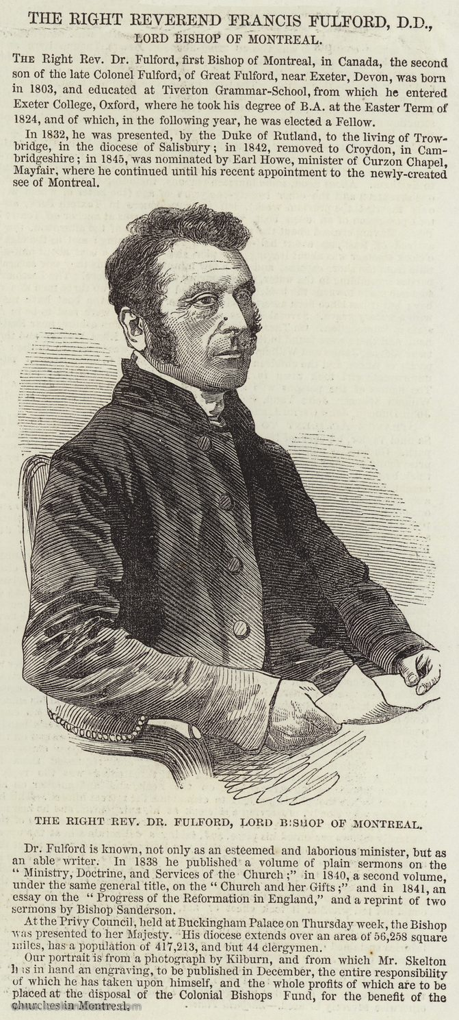 The Right Reverend Francis Fulford, DD, Lord Bishop of Montreal. Illustration for The Illustrated London News, 24 August 1850.